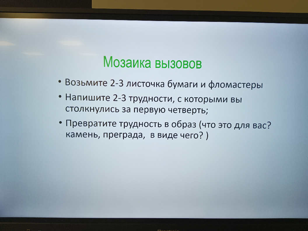 В осенние каникулы для молодых педагогов школы была организована встреча по итогам первой четверти. В деятельностном режиме учителя определи успешные моменты первого учебного отрезка года и поделились своими сложностями. Групповая и парная работа позволила не только определить трудности, но и смоделировать пути решения, а также наметить дальнейшие шаги профессионального роста.